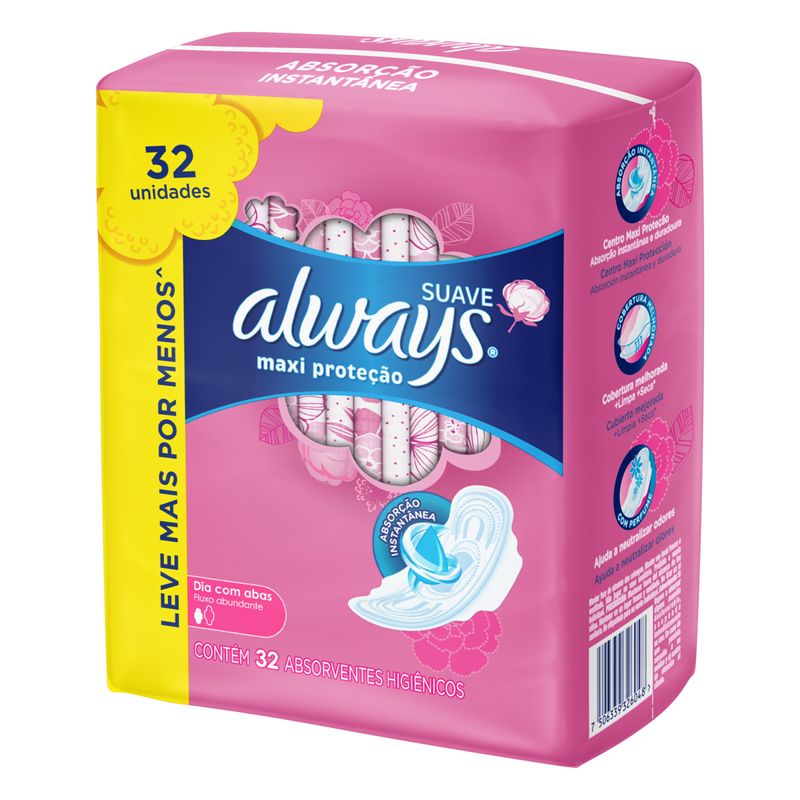 O absorvente Always C/Abas é um produto de alta qualidade, projetado para atender às necessidades das mulheres modernas. Com 32 unidades por embalagem, ele é prático e fácil de armazenar. As dimensões e o formato do absorvente foram cuidadosamente pensados para proporcionar um ajuste perfeito, garantindo que você se sinta à vontade durante todo o dia.