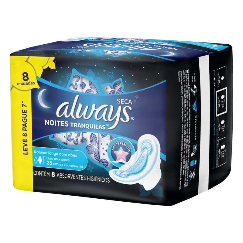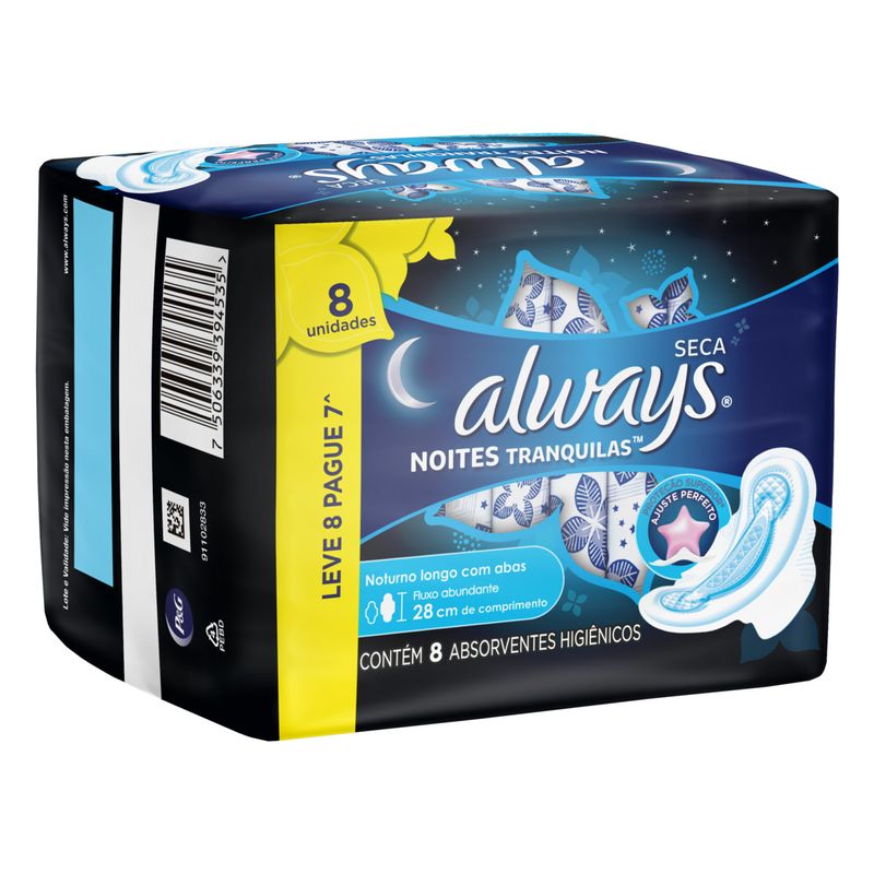 O Absorvente Always Noites Tranquilas foi desenvolvido para oferecer proteção e conforto durante toda a noite. Sua cobertura seca e abas laterais garantem segurança contra vazamentos.