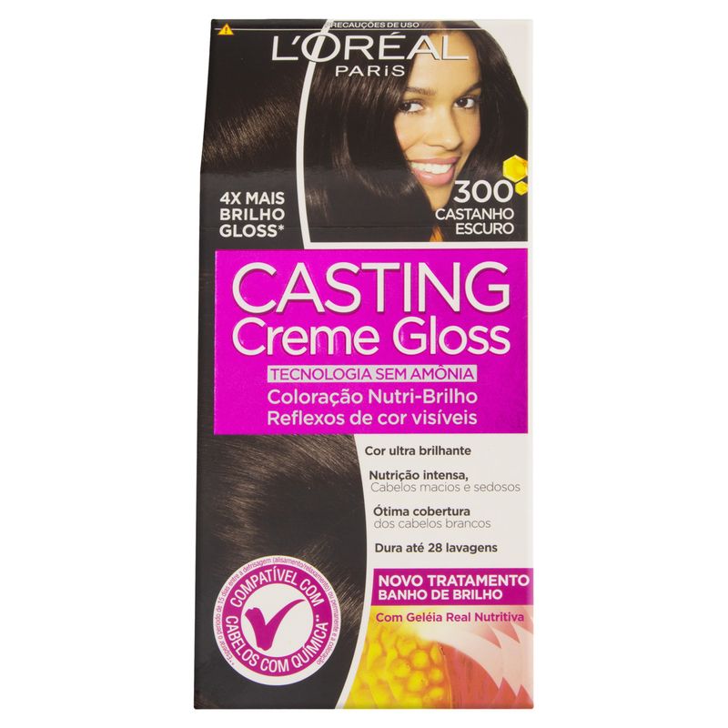 A Coloração Casting Creme Gloss na tonalidade Castanho Escuro 600 é a escolha ideal para quem deseja um cabelo com cor vibrante e brilho intenso. Esta coloração proporciona uma cobertura perfeita dos fios brancos, garantindo um resultado natural e luminoso. Com sua fórmula enriquecida, o produto não apenas colore, mas também cuida dos cabelos, deixando-os macios e sedosos.
