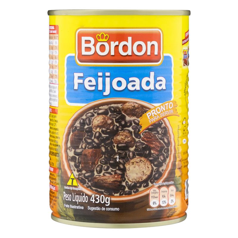 A Feijoada Bordon Lata 430g é mais do que um prato pronto; é uma experiência que traz o melhor da tradição brasileira para a sua mesa. Com sua combinação de praticidade, sabor e qualidade, é a escolha ideal para quem valoriza uma alimentação saborosa e autêntica. Aproveite cada garfada e descubra o prazer de saborear uma verdadeira feijoada!