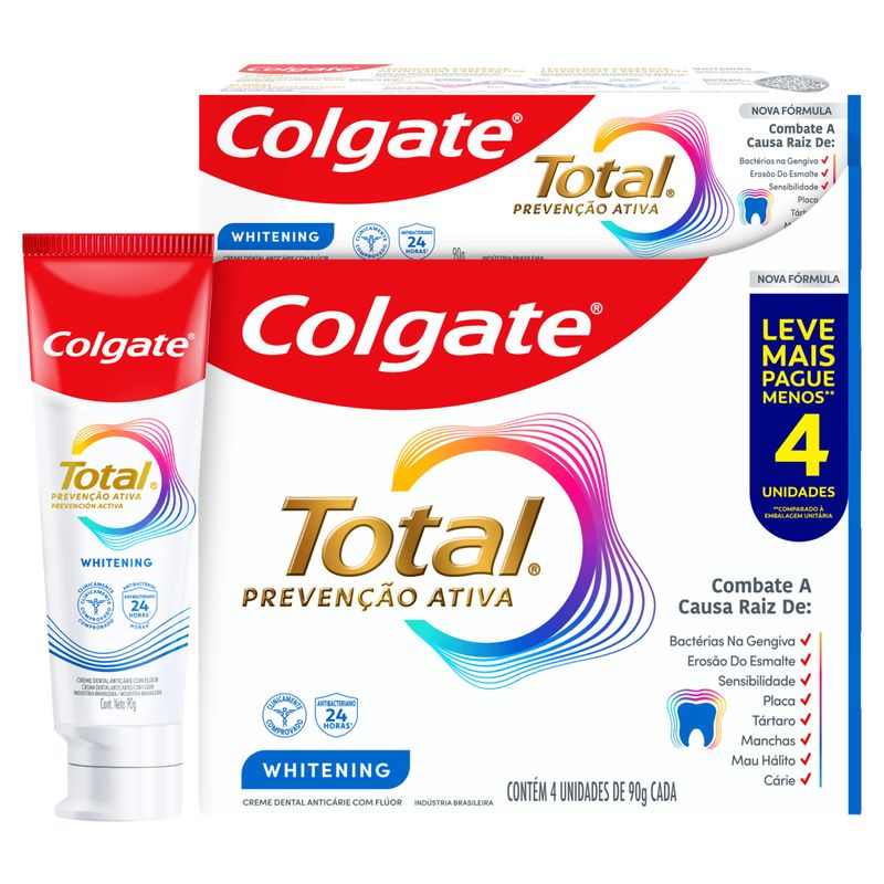 O Pack Creme Dental Colgate Total 12 Whitening é a escolha ideal para quem busca um sorriso mais branco e saudável. Com quatro unidades de 90g cada, este creme dental oferece uma proteção abrangente, combatendo as cáries e promovendo a saúde bucal de forma eficaz. Sua fórmula avançada ajuda a remover manchas e a prevenir o acúmulo de placa bacteriana, garantindo dentes mais limpos e um hálito fresco ao longo do dia.