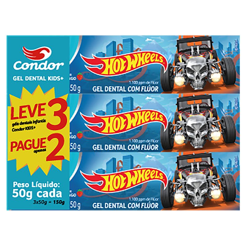 Pack Gel Dental Condor Kids+ Infantil C/ Flúor Morango Hot Wheels 50g Cada Leve 3 Pague 2 Unid