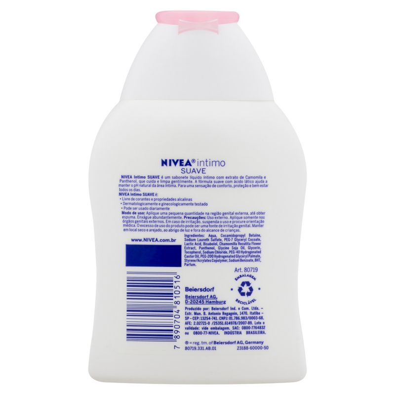 Para obter os melhores resultados, recomenda-se aplicar uma pequena quantidade do Sabonete Íntimo Nivea Suave Camomila na palma da mão, diluir com água e aplicar suavemente na região íntima externa. Enxágue bem com água morna. Este produto é indicado para uso diário e pode ser utilizado em qualquer fase da vida da mulher, desde a adolescência até a maturidade, sempre respeitando as necessidades do seu corpo.